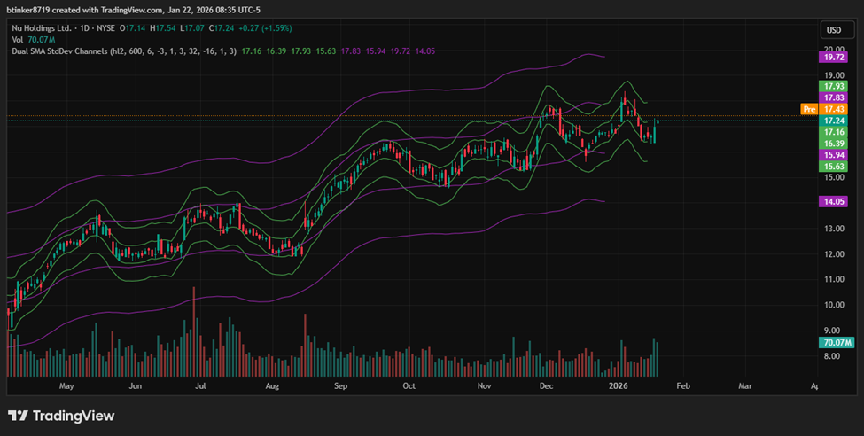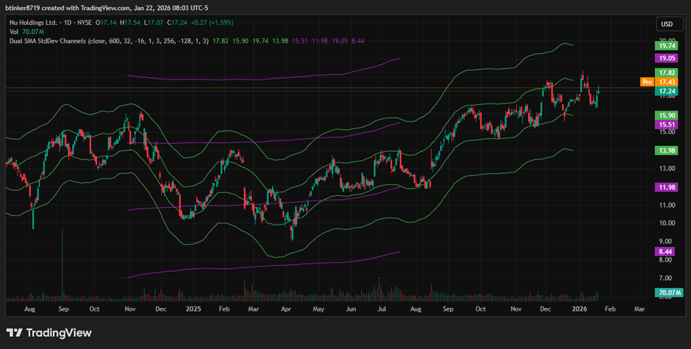 The channels shown on the charts are constructed using standard deviations from a centered moving average. The boundaries (upper and lower bands) represent areas where, based on historical price action, the price is likely to remain a certain percentage of the time (e.g., 68% for ±1 standard deviation, 95% for ±2 standard deviations). This is analogous to a confidence interval in statistics: the bands are dynamic, expanding and contracting as volatility changes.